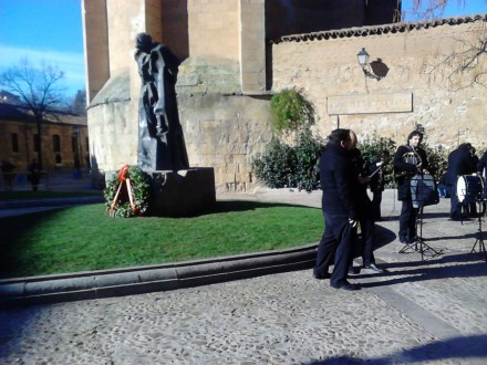El pasado treinta y uno de diciembre de 2014 no faltamos a la cita, en la que se honró con una corona de flores a tan relevante e históricamente trascendental personaje de la sociedad salmantina. Hace tres años se celebró el LXXV aniversario de su muerte, la celebración entonces, fue tan sencilla como otras veces pero si cabe, con el paso del tiempo, el recordatorio al pensador y filósofo de la Universidad de Salamanca va ganando adeptos y seguidores. Este año la ceremonia ha sido protagonizada por algunos integrantes de la Sociedad de Amigos de Unamuno. Éstos nos han deleitado a los allí reunidos, con sus impresiones e incluso poemas, sus palabras y su respeto: Santiago Juanes, Juan Carlos López Pinto y Marta García Gasco clamaron, declamaron y proclamaron mientras el alcalde de la ciudad Alfonso Fernández Mañueco y Ana Chaguaceda (directora de la Casa-Museo de Unamuno), acompañados por la Banda Municipal de Música colocaron una corona de flores ante la estatua del querido barbitaheño y humilde pensador, agnóstico reconocido pero piadoso y cristiano, al que durante poco más de un cuarto de hora tratan de rememorar y evocar: a nuestro Unamuno, único y necesario que si no hubiera existido lo tendríamos que haber inventado.